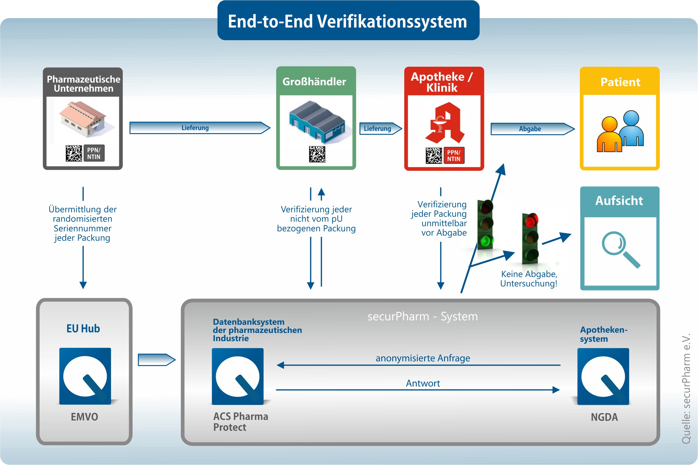 Die Verordnung sieht ein System vor, in dem alle Arzneimittel, welche die Sicherheitsmerkmale tragen, durch eine End-to-end-Verifizierung identifiziert und auf ihre Echtheit überprüft werden können.